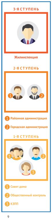 На рисунке на странице 9 «Азбуки ЖКХ» наглядно продемонстрированы все три ступени контроля, а именно: 1-я ступень — Совет дома, Общественный контроль, КЗПП; 2-я ступень — Районная администрация, Городская администрация, 3-я ступень — Жилинспекция.